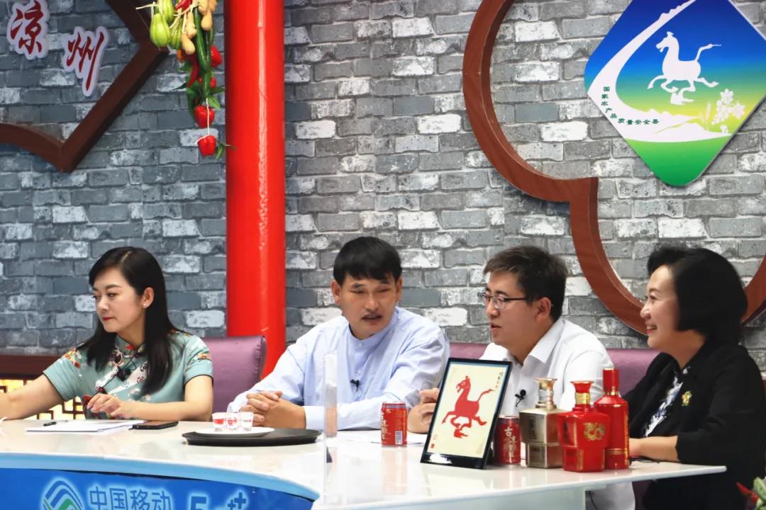 在直播間帶貨現(xiàn)場,涼州區(qū)區(qū)委副書記楊璐,區(qū)常常委、區(qū)委宣傳部部長李曉瑛以及主持人,攜手“大衣哥”朱之文為皇臺酒直播帶貨。在帶貨現(xiàn)場,朱之文仔細品味了皇臺酒后,連聲說好!并深情地唱起了酒歌。