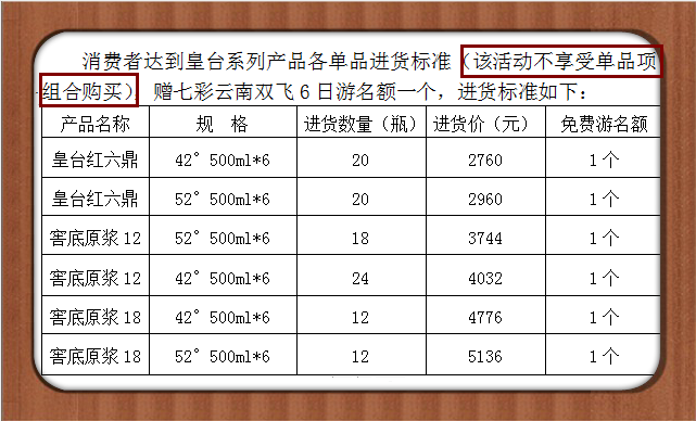 各位親,不論您是婚宴喜事,還是喬遷新居;不論是商超進(jìn)貨,還是好酒收藏……只要您進(jìn)購以下同等價(jià)值的皇臺(tái)美酒,即可獲得一場說走就走的七彩云南雙飛6日游的美好之旅。