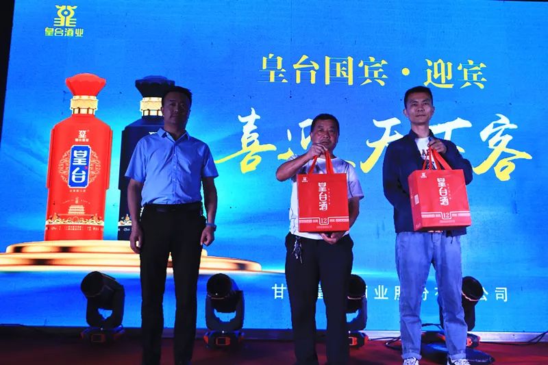 甘肅皇臺酒業(yè)股份有限公司營銷副總監(jiān)姚德軍和甘肅日新皇臺酒銷售有限公司總經(jīng)理辛秀山為二等獎(jiǎng)幸運(yùn)觀眾頒發(fā)國賓酒2盒