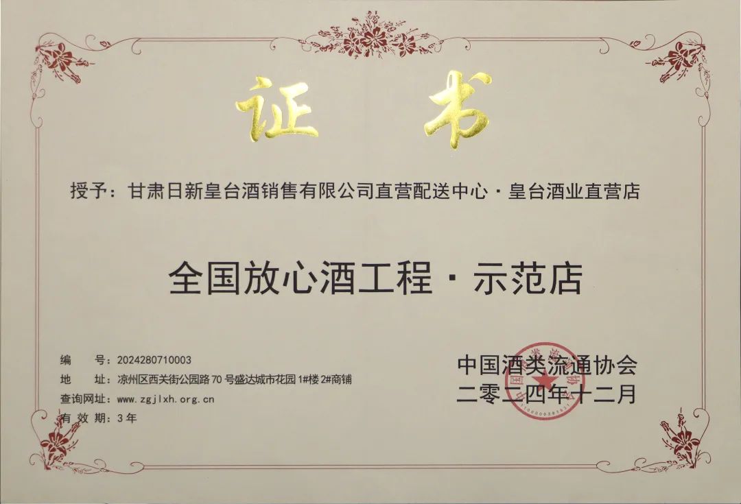 12月中旬,2024年中國酒類流通協(xié)會公布了全國放心酒工程示范企業(yè)(店)名單,甘肅皇臺酒業(yè)股份有限公司憑借優(yōu)異的品質(zhì)和信譽,成功榮獲了全國放心酒工程·示范企業(yè)殊榮。與此同時,甘肅日新皇臺酒銷售有限公司直營配送中心也因其優(yōu)質(zhì)的服務(wù)和管理,榮獲了全國放心酒工程·示范店稱號。