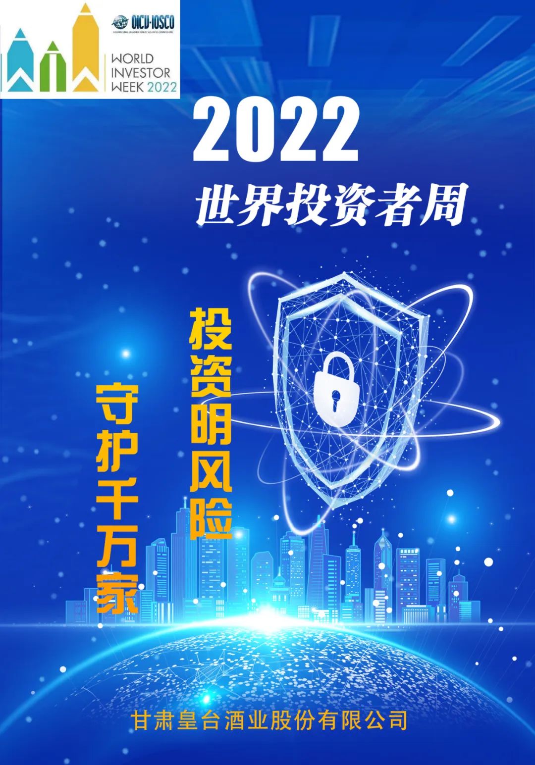 2022年10月8日-14日為“2022年世界投資者周”,本次活動(dòng)主題為“投資明風(fēng)險(xiǎn),守護(hù)千萬(wàn)家”。為貫徹落實(shí)監(jiān)管部門投資者保護(hù)工作的部署要求,加強(qiáng)投資者教育保護(hù)的國(guó)際交流合作,積極響應(yīng)“2022年世界投資者周”活動(dòng)號(hào)召,皇臺(tái)酒業(yè)在監(jiān)管部門的指導(dǎo)下,將以“投資明風(fēng)險(xiǎn),守護(hù)千萬(wàn)家”為主題,開(kāi)展投資者教育和保護(hù)宣傳,面向投資者做好證券基金期貨知識(shí)宣傳普及,引導(dǎo)投資者學(xué)習(xí)金融知識(shí),樹(shù)立正確投資理念!