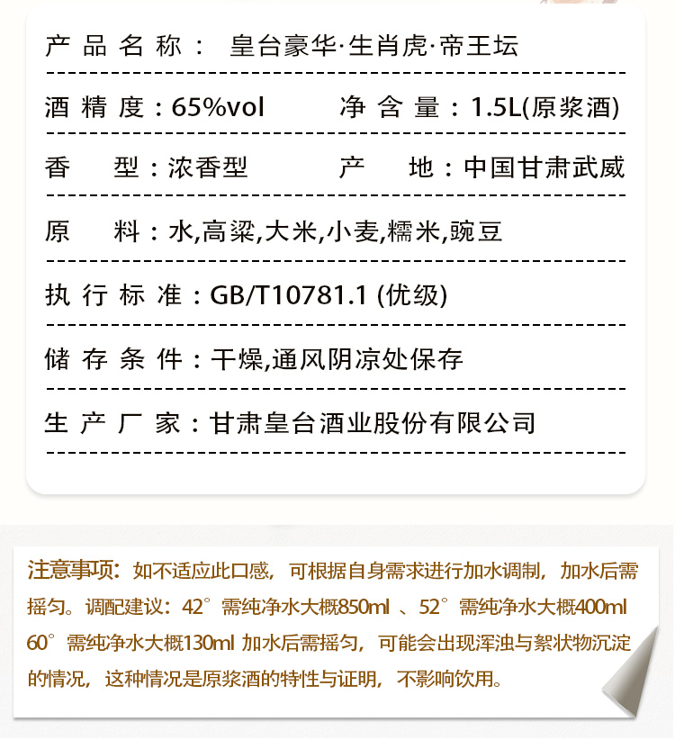 皇臺甘肅皇臺65度虎兔生肖紀(jì)念1.5L壇裝酒純糧食釀造原漿高度白酒 虎年生肖酒1.5L裝